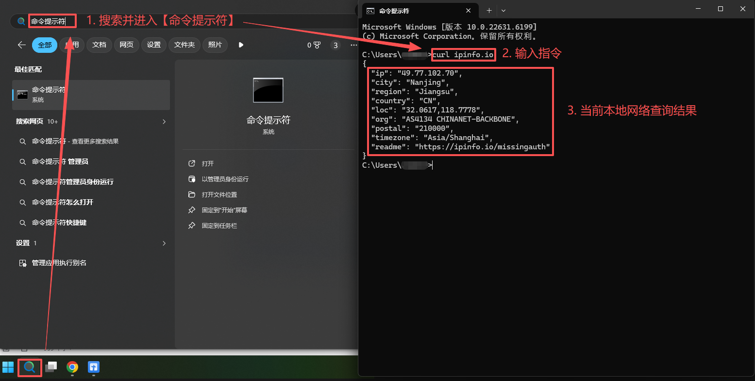 1. 命令行检测(推荐):电脑搜索框内搜索【命令提示符】,输入代码 curl ipinfo.io,并回车即可查看目前所在的国家和IP地址