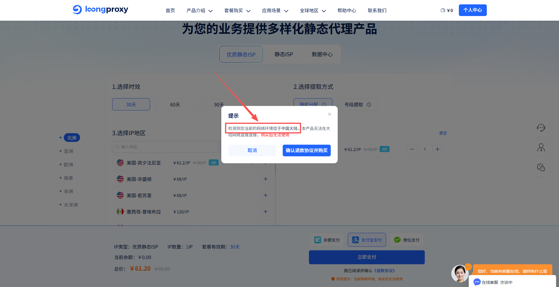 3. LoongProxy官网:若您已注册LoongProxy,在提交订单时,系统会自动检测您当前的环境,若不满足海外环境条件,将触发提示弹窗