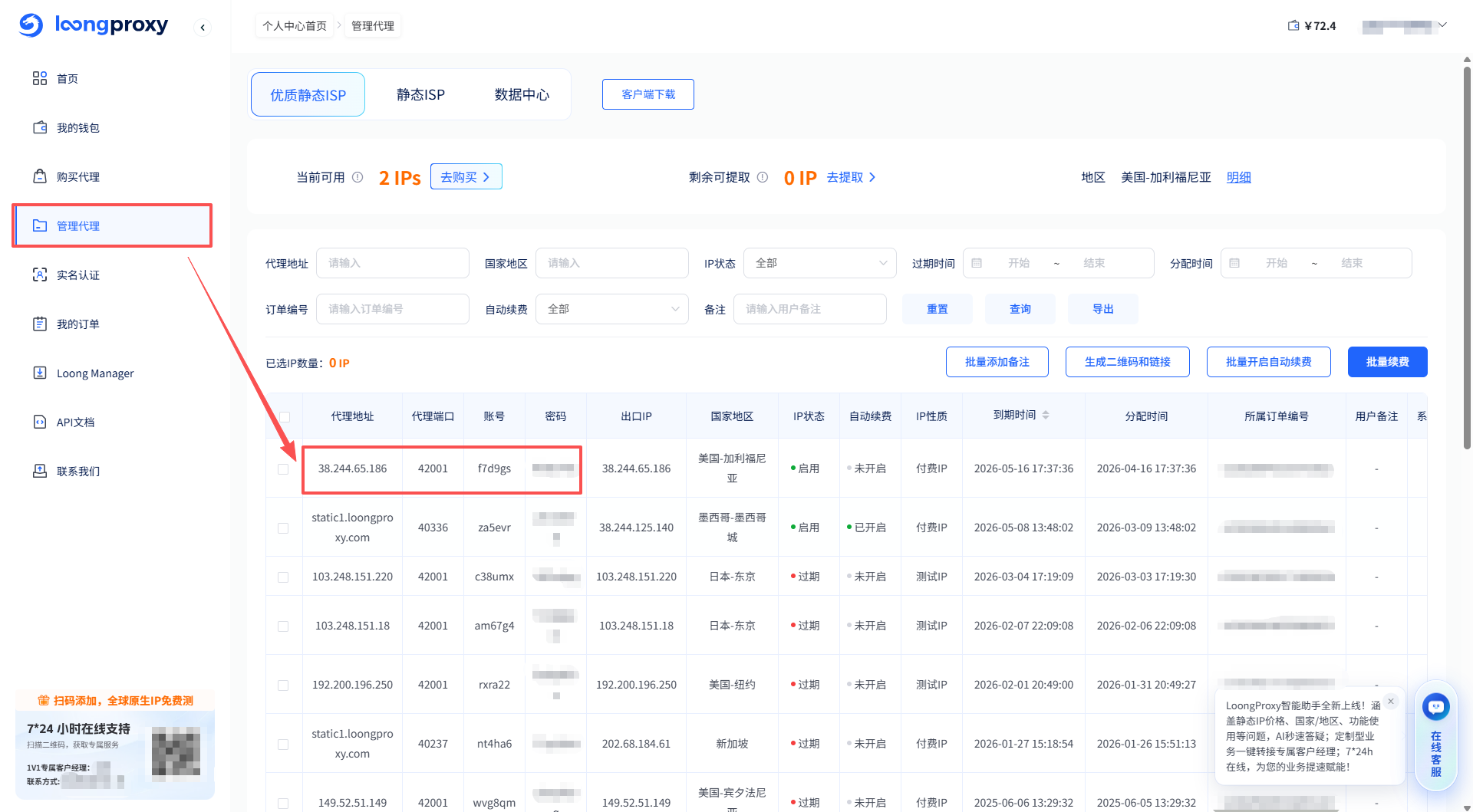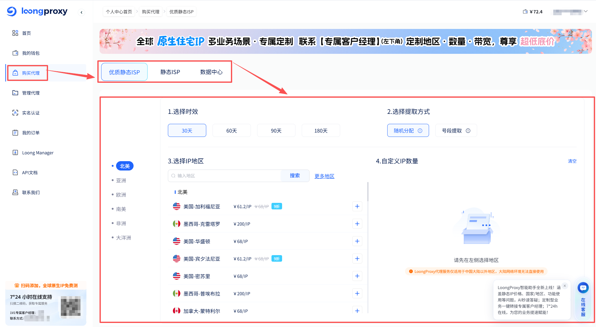 1)购买代理IP:若您已具备可用的海外网络环境,并已通过LoongProxy免费试用,验证了业务适配性,可登录【个人中心】后前往【购买代理】页进行选购