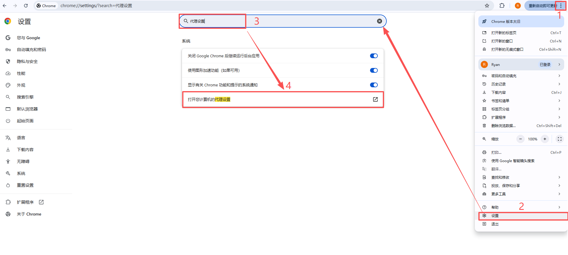 ① 进入【代理设置】页:进入 Chrome【设置】 → 【系统 】→【 打开计算机的代理设置】或直接在搜索框内输入“代理设置”,然后点击【 打开计算机的代理设置】,将跳转至电脑系统【网络和Internet】界面