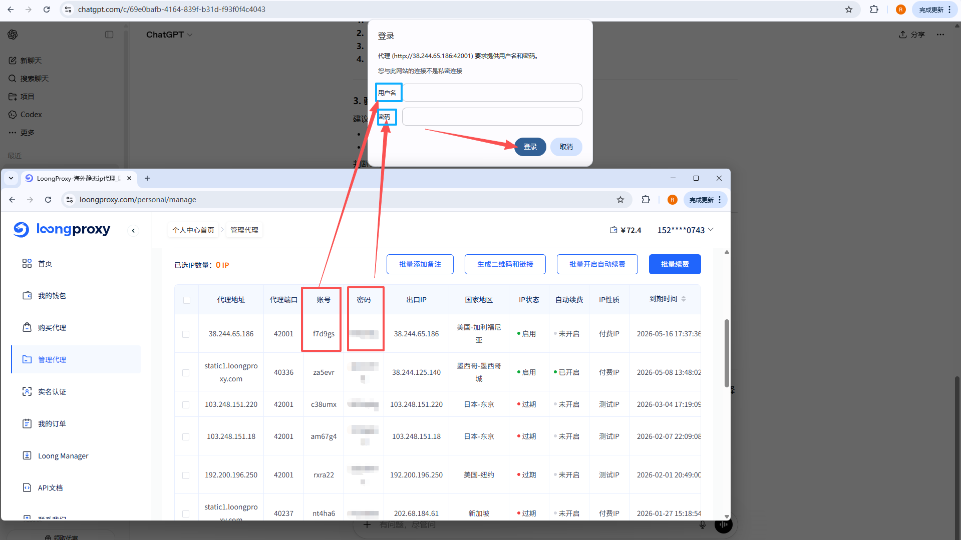 b. 填写账号和密码:点击“认证”按钮,将 LoongProxy 提供的账号、密码填写至【用户名】【密码】字段,确认无误后点击【保存更改】