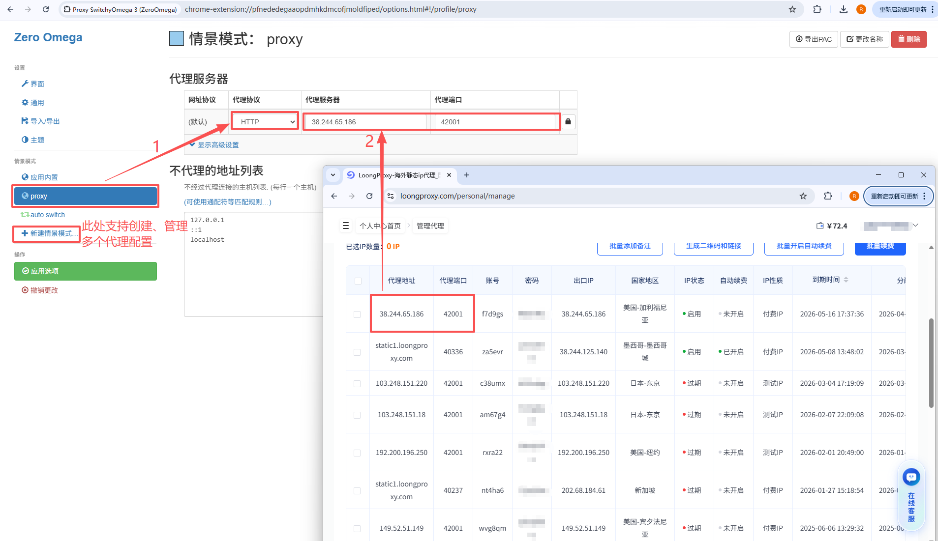 a. 填写IP和端口:安装完成后会自动进入插件设置页面,点击【proxy】(也可通过【新建情景模式】创建多个代理配置),将【代理协议】选择为 HTTP 或 HTTPS,并将 LoongProxy 提供的代理地址、代理端口分别填写至对应字段
