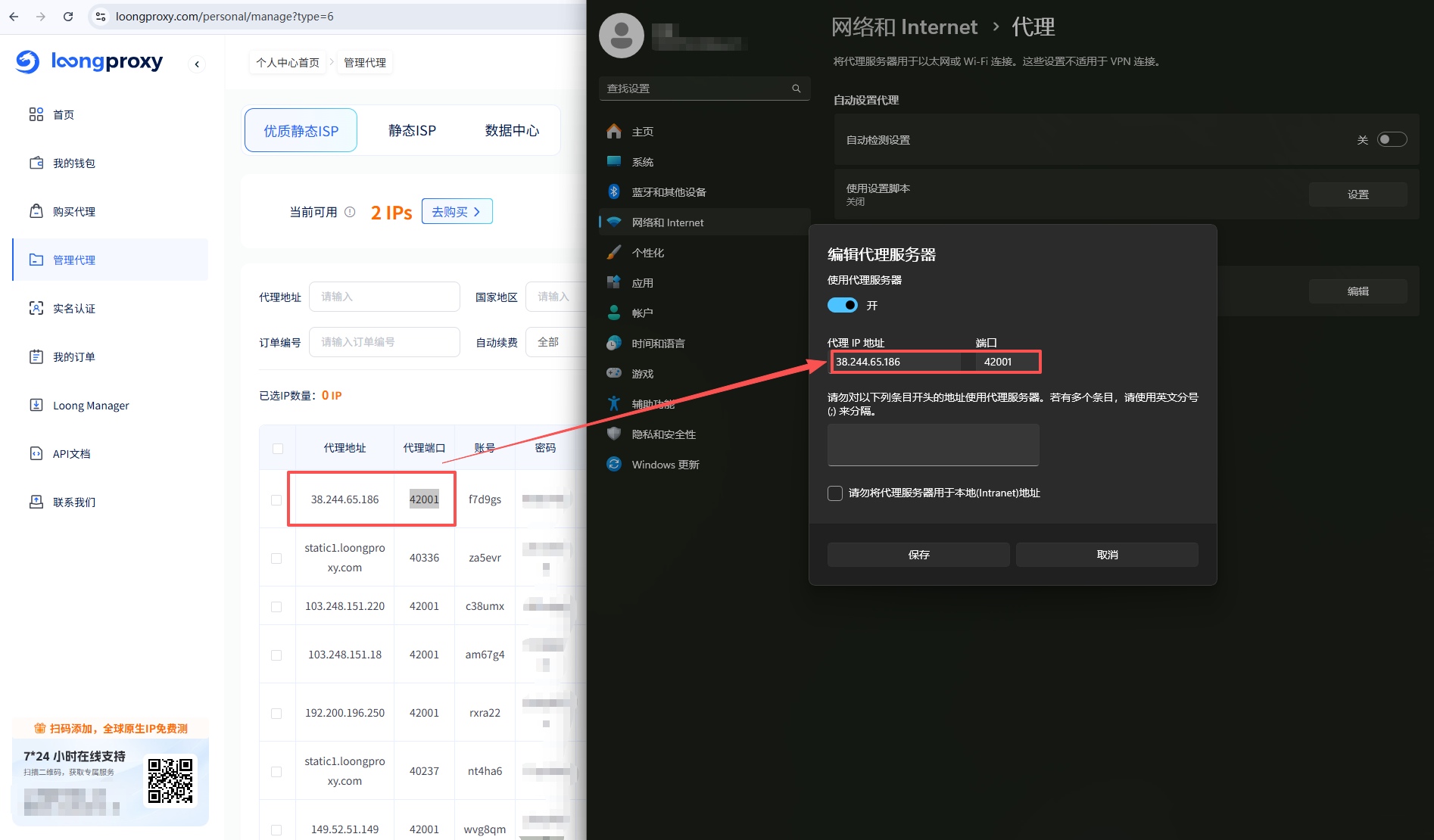 b. 填写IP地址与端口:开启【使用代理服务器】,把在LoongProxy上购买的代理地址、代理端口填写至相应字段,填写完成后保存,即可完
