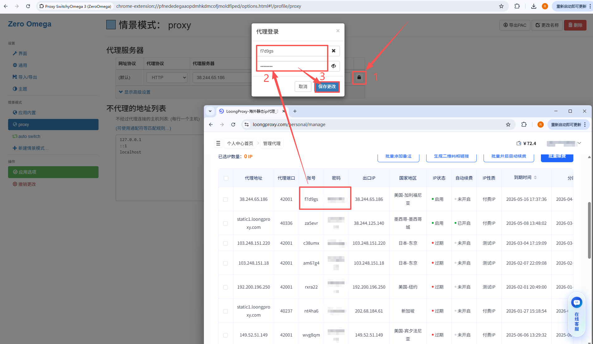 点击谷歌浏览器右上角【扩展程序】,选择SwitchyOmega插件,并切换至刚刚配置的代理模式【proxy】,即可通过LoongProxy代理进行业务访问